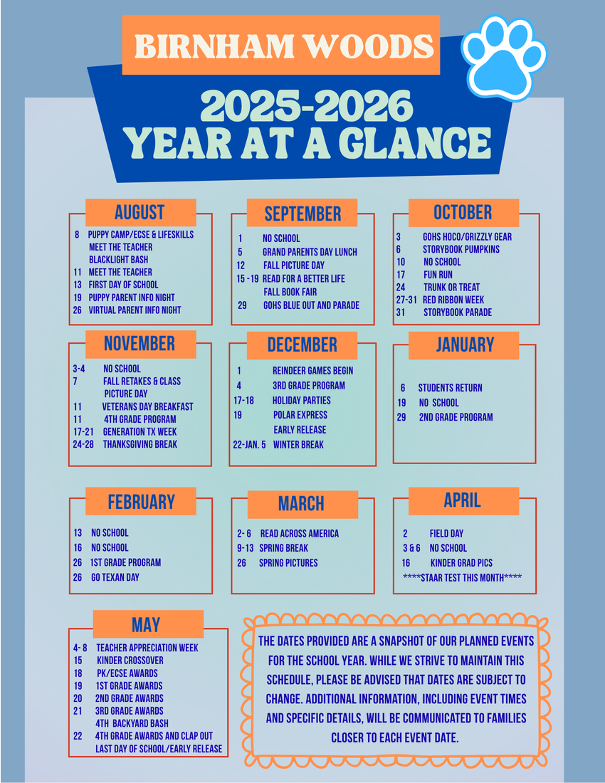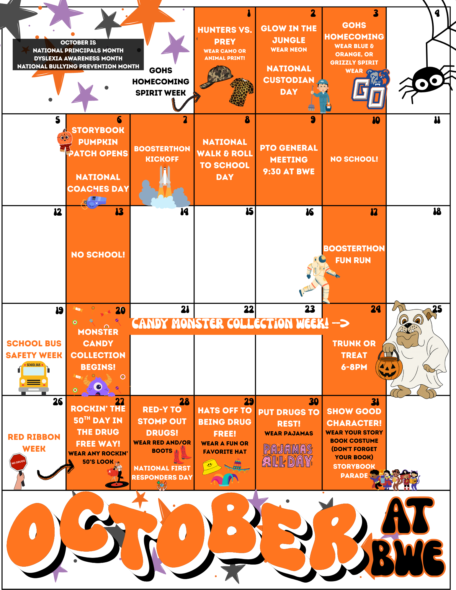 BIRNHAM WOODS PTO NEWSLETTER October 2025 PTO MONTHLY CALENDAR OF EVENTS (Click image to print a copy of the calendar) BOOSTERTHON IS COMING IMPORTANT PTO UPDATES IMPORTANT UPDATES BUY A BIRTHDAY GRAM VOLUNTEER TODAY JOIN OUR GROUP PRE-ORDER TODAY UPCOMING SPIRIT NIGHTS SAVE THE DATE IT’S EASY TO SUPPORT BWE – HERE’S HOW YOU CAN HELP IMPORTANT SCHOOL UPDATES Teacher Favorites Found Here THANK YOU TO OUR PTO SPONSORS THANK YOU TO OUR PTO SPONSORSWe appreciate all of the local business who choose to support Birnham Woods Elementary PTO. BECOME A SPONSOR